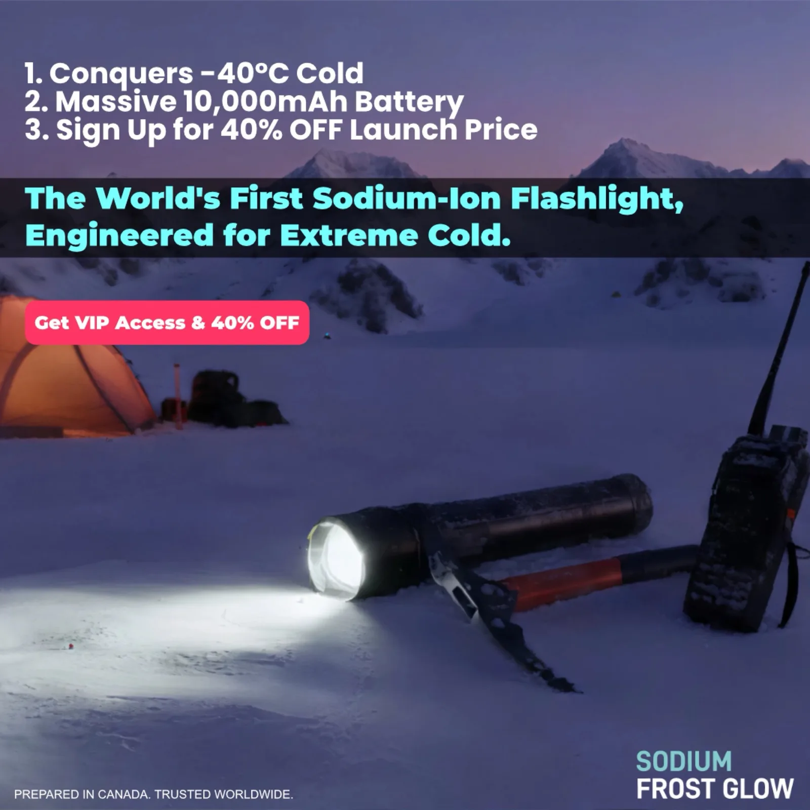 Las pilas de litio funcionan mejor por encima del punto de congelación, ya que su voltaje cae mucho más rápido a temperaturas muy bajas, lo que reduce drásticamente su autonomía. Una nueva linterna pretende resolver este problema utilizando una pila de iones de sodio. Se supone que esta pila conserva el 88% de su autonomía habitual a -40°C, frente a sólo el 15% con una pila de litio.