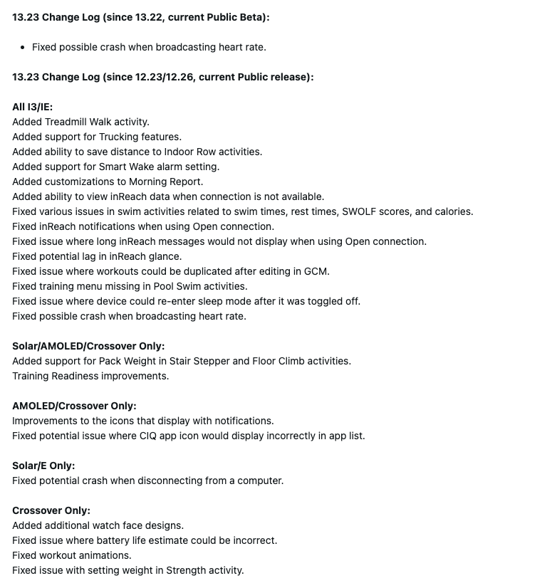 La versión 13.23 del software beta se ha compartido con los smartwatches Instinct 3, Instinct E e Instinct Crossover a través del aire. Según un post reciente del foro de Garmin en https://forums.garmin.com/beta-program/instinct-3/f/announcements/430973/beta-version-13-23--available-otase ha enviado a todos los usuarios y debería recibirla la próxima vez que se conecte a la aplicación para smartphone Garmin Connect Manager a través de Bluetooth o a Garmin Express en su ordenador.
