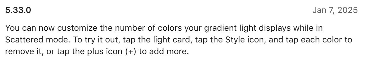 Según el registro de cambios de la versión 5.33 de la aplicación Philips Hue, los usuarios tienen ahora más control sobre el modo Disperso para las luces degradadas. En el modo Disperso, varios colores se salpican a lo largo de la luz en orden aleatorio. Los usuarios ya podían elegir los colores, y ahora también pueden seleccionar el número de colores utilizados para este efecto de iluminación degradada. Esta función podría utilizarse en productos como la lámpara de mesa Philips Hue Gradient Signe(actualmente 171,81 $ en Amazon).