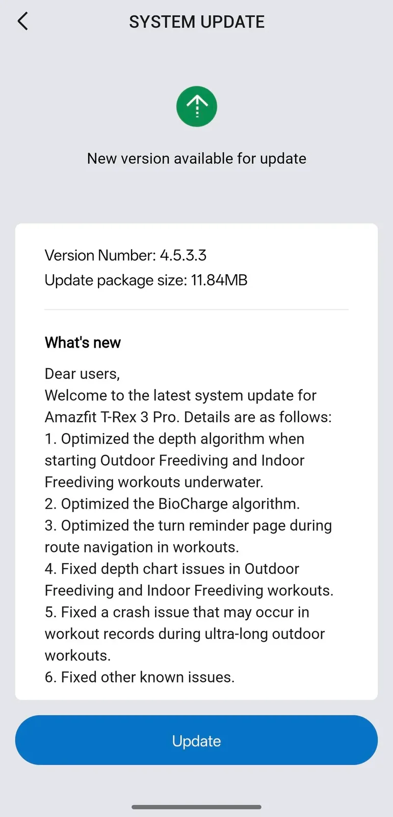 La versión de software 4.5.3.3 ha sido reportada por los usuarios del smartwatch Amazfit T-Rex 3 Pro en Reddit. Se dice que este archivo de 11,84 MB trae optimizaciones en el algoritmo de profundidad, relacionadas con los entrenamientos de apnea al aire libre y apnea en interiores. También se dice que se han introducido mejoras en la página de recordatorio de giro, que se sirve a los usuarios a mitad del entrenamiento cuando utilizan la función de navegación de ruta. Además, Zepp Health indica que ha mejorado el algoritmo BioCharge, aunque no cuantifica el beneficio para los usuarios.
