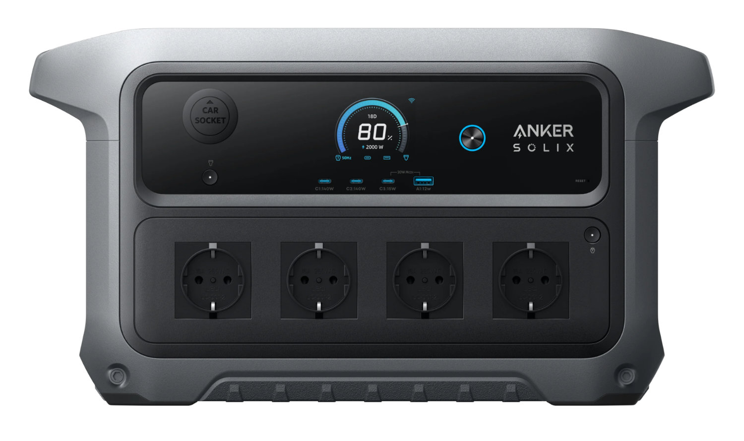 La Solix C2000 Gen 2 tiene capacidad de carga rápida, con seis métodos de recarga disponibles. Cuando se carga con una combinación de CA y energía solar, debería recargarse completamente en 58 minutos. Los métodos de carga alternativos incluyen un cargador de alternador, un enchufe de coche o un generador de gas. Hay un total de nueve puertos de salida en la Anker Solix C2000 Gen 2, con soporte para una salida continua de 2.400 W y una potencia máxima de 4.000 W. Las salidas incluyen cuatro puertos de CA, un cargador de coche, un USB-A de 12W y tres puertos USB-C, dos de los cuales pueden suministrar hasta 140W. La C2000 Gen 2 pesa 18,9 kg (~41,7 libras) y mide 455 x 258 x 311 mm (~17,9 x 10,2 x 12,2 pulgadas), lo que la hace relativamente compacta y ligera.