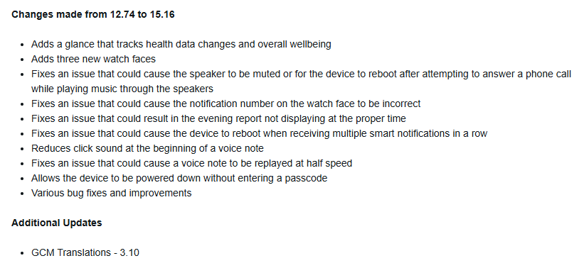 El registro de cambios de la versión 15.16 indica que se ha bajado el volumen del sonido de clic que se reproduce al iniciar una nota de voz. Garmin ha solucionado un problema que podía hacer que el altavoz se silenciara incorrectamente al intentar responder a una llamada telefónica. También ha solucionado problemas relacionados con el número de notificación que aparecía en la esfera del reloj y la hora incorrecta que aparecía en el informe vespertino. Además, Garmin Connect Mobile Translations se ha actualizado a la versión 3.10, aunque no está claro en qué beneficia esto a los usuarios.