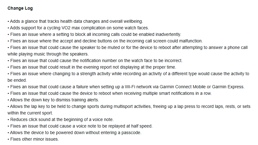 Tras instalar la versión beta 15.07, los usuarios de los smartwatches Forerunner 570 y Forerunner 970 podrán utilizar la tecla abajo para descartar las alertas de entrenamiento, mantener pulsada la tecla de vuelta para cambiar de deporte durante una actividad multideportiva y apagar el dispositivo sin necesidad de un código de acceso. Además, hay una amplia gama de correcciones de errores que abordan problemas relacionados con las llamadas entrantes, el informe nocturno y la actividad de fuerza. Garmin también indica que ha reducido el ruido de clic que se reproduce al inicio de una nota de voz. A continuación encontrará una captura de pantalla del registro de cambios completo.