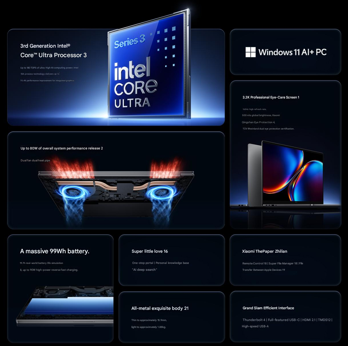 Hay tres configuraciones principales disponibles para los dos, y la opción base cuenta con el Intel Core Ultra 5 325, un procesador de gama media de la línea. Está emparejado con 24 GB de RAM y 1 TB de almacenamiento. La segunda configuración lo eleva al Core Ultra 5 338H, una opción más capaz con la iGPU Arc B370. Xiaomi emparejó esta opción con 32 GB de RAM y 1 TB de almacenamiento.