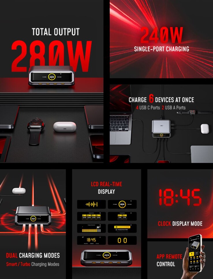 El cargador de sobremesa AOHi 280W GaN+ es una estación de carga de sobremesa que puede alimentar diversos dispositivos. Visualmente, se parece mucho a las conocidas alternativas de Anker y EcoFlow. Con una potencia de salida de hasta 280 W, este nuevo modelo se sitúa justo entre ellas. La alimentación se suministra a través de un total de seis puertos, concretamente cuatro USB-C y dos USB-A. Se pueden suministrar hasta 240 W a través de un único puerto USB-C, lo que permite cargar muy rápidamente incluso dispositivos potentes como ordenadores portátiles y similares.