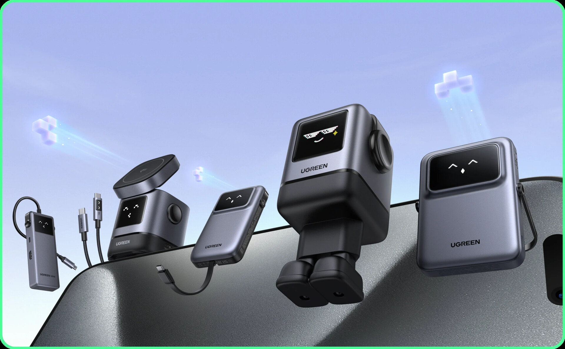 El mismo sello distintivo de Uno también se encuentra ahora en un nuevo 6 en 1 USB-C Hub; la versión de serie del plegable UGREEN 2 en 1 estación de carga inalámbrica magnética, e incluso un cable USB-C a -C de 100W. En ese sentido, el último, más grande y potente 100W del Uno (antes Nexode RG) power brick también está presente en el stand.