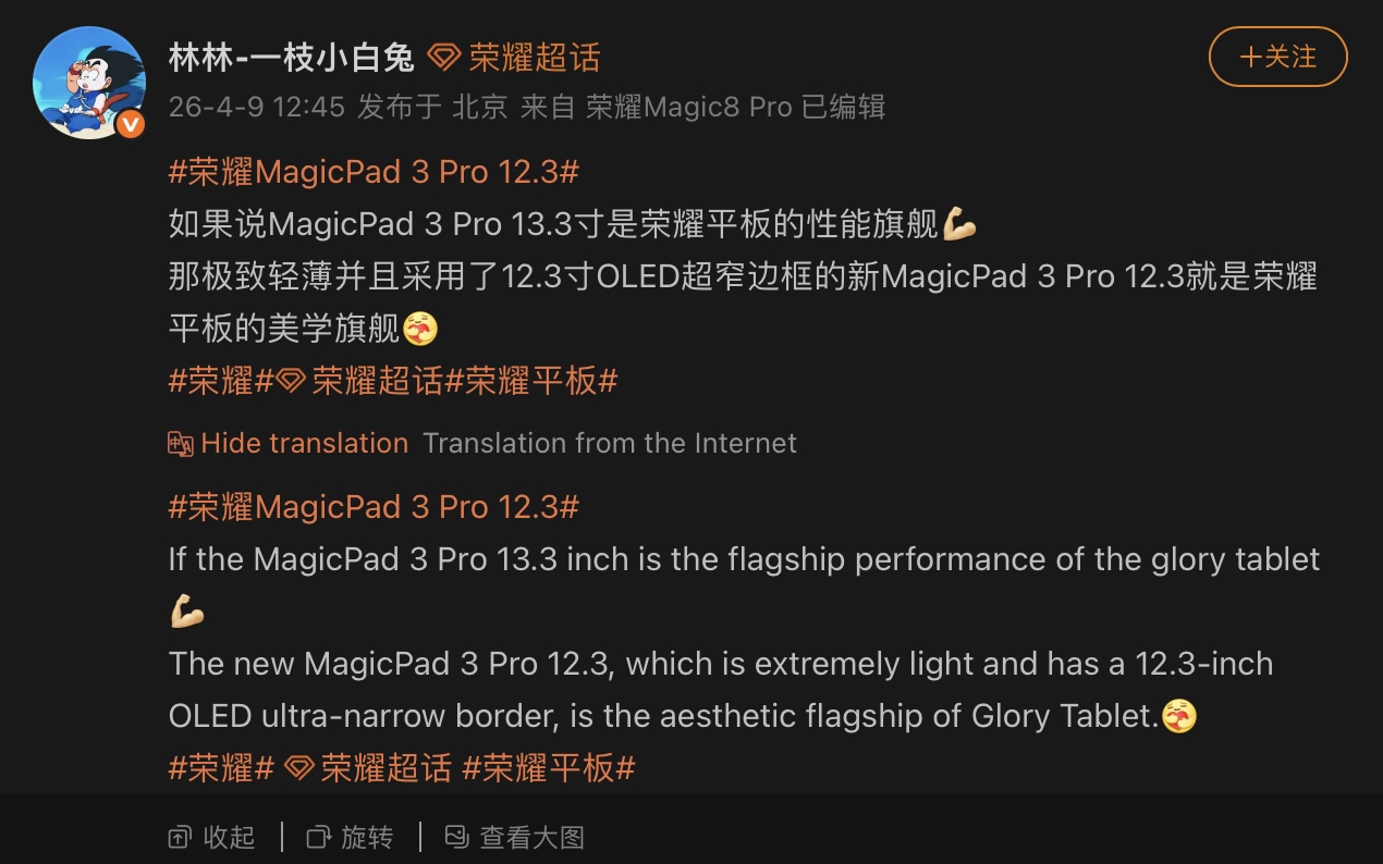 El post de Weibo también reveló que la tableta OLED MagicPad 3 Pro de 12,3 pulgadas pesará sólo 440 gramos, o alrededor de 14,11 onzas. El diseño general de la tableta parece ser idéntico al de la variante equipada con IPS, con cámaras duales en la parte trasera y biseles ultrafinos en la parte delantera. Aún no se han revelado otros detalles sobre la tableta, y lo mismo cabe decir de su precio y disponibilidad.