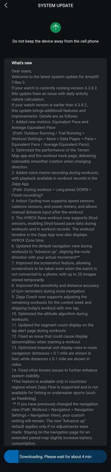 Los usuarios del reloj inteligente Amazfit T-Rex 3 ahora pueden grabar notas de voz durante los entrenamientos, y se han mejorado el Mapa del terreno y la página de seguimiento de los entrenamientos. Puede encontrar el registro de cambios completo para la versión de software 4.3.8.4 a continuación. No está claro cuándo se completará el despliegue de esta nueva actualización. Cuando esté disponible, podrá instalar esta actualización de Amazfit T-Rex 3(actualmente 249,99 $ en Amazon) a través de la aplicación Zepp.