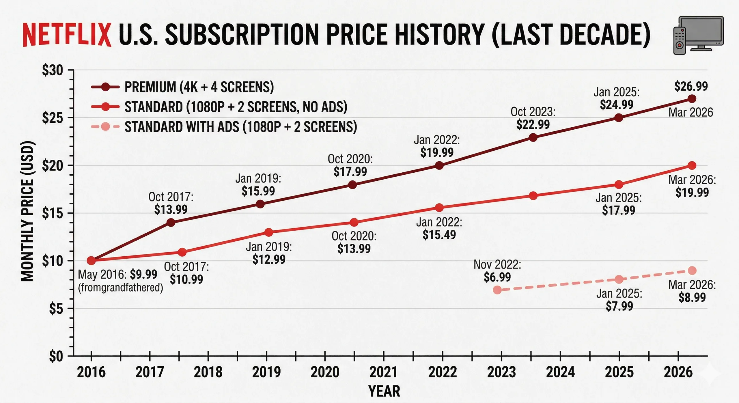 Netflix acaba de subir sus precios de suscripción en EE.UU por segunda vez en un año. El nuevo cálculo empieza a parecer un impuesto directo sobre su hardware. A partir del 26 de marzo de 2026, el nivel Premium 4K ha subido a 26,99 dólares al mes, mientras que el nivel básico con publicidad parece estar más anclado en 8,99 dólares. Esto crea una enorme delta de precios que básicamente obliga a elegir entre dos cosas que solían considerarse estándar: la resolución de su pantalla y la privacidad de sus hábitos. Si compró un portátil de gama alta como un MacBook Pro M5 específicamente por su brillo máximo de 1.600 nits y su pantalla Mini LED, Netflix le está cobrando ahora una gran cuota anual sólo por ver lo que esa pantalla puede hacer realmente.