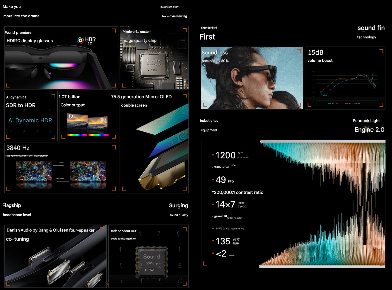 Hay un chip DSP dedicado https://www.soundguys.com/what-is-dsp-28013/ que, junto con el ajuste de Bang & Olufsen, se afirma que hace que las gafas AR ofrezcan un audio de "nivel de auriculares insignia". Otra mejora notable con respecto a las Air 3S Pro es que las nuevas gafas inteligentes cuentan con pantallas HDR10.