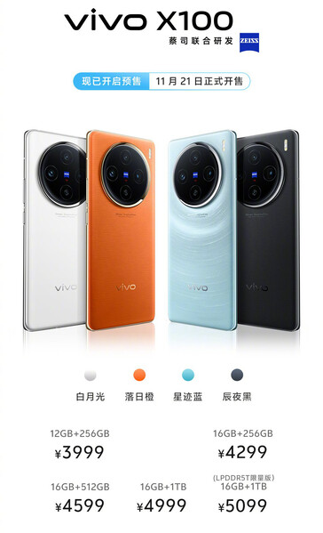 La serie Vivo X100 comienza en 3.999 CNY (~549 dólares) para el X100 con 12 GB de RAM y 256 GB de almacenamiento. Como referencia, Vivo cobra hasta 5.099 CNY (~US$700) por el mismo dispositivo con 16 GB de RAM y 1 TB de almacenamiento. Por el contrario, el X100 Pro cuesta al menos 4.999 CNY (~686 dólares estadounidenses) y sube a 5.999 CNY (~824 dólares estadounidenses) para las mismas configuraciones de memoria. Lamentablemente, Vivo aún no ha comentado nada sobre la disponibilidad global, algo que también se aplica al nuevo Vivo Watch 3. Consulte las imágenes siguientes para conocer todos los detalles sobre los precios.