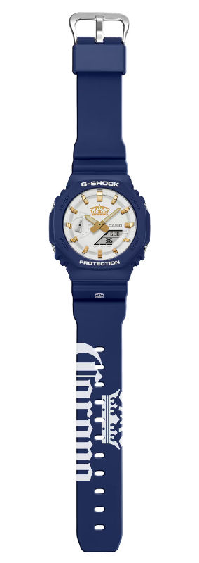 El G-Shock GA-2100CR25-2A tiene una esfera blanca con acentos dorados como los índices y las dos agujas analógicas. Además, el icono de la corona Corona está impreso en dorado en la esfera y en blanco en la correa. El reloj tiene el bisel, la caja y la correa de resina azul, esta última también con el logotipo de la marca en blanco.