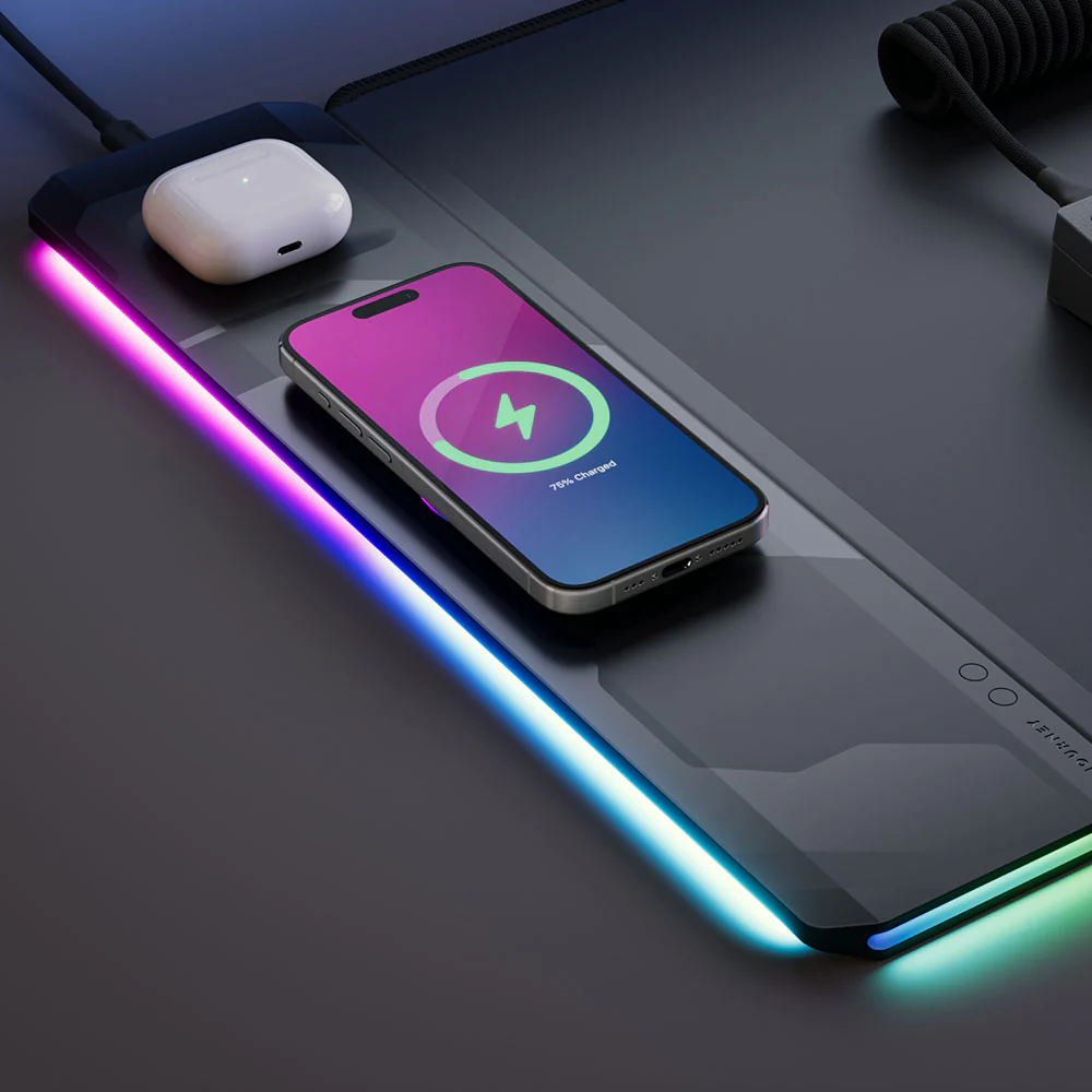 La alfombrilla de escritorio Journey Alti Play Performance ya está disponible para pedidos anticipados en EE.UU. Este accesorio de carga de sobremesa se basa en la Alti original, con la adición de iluminación RGB para aportar algo de luz ambiental a su espacio. En el lado izquierdo de la alfombrilla más grande se encuentra la zona de carga. Está alimentada por USB-C y le permite cargar de forma inalámbrica hasta dos dispositivos; hay un panel de carga de 15 W habilitado para Qi2 para un teléfono y un segundo cargador de 5 W para auriculares.