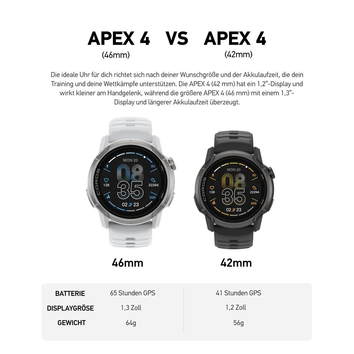 Dependiendo del tamaño, incorpora una pantalla MIP de 1,3 o 1,2 pulgadas, que se supone facilita la lectura bajo la luz directa del sol. La duración de la batería cuando se registran actividades se especifica en 65 o 41 horas, lo que debería ser suficiente para ultramaratones. A modo de comparación, el Apple Watch Series 9 se queda sin batería tras sólo 1,5 días en uso típico, sin GPS y con la pantalla siempre encendida. Se puede monitorizar el sueño, la variabilidad de la frecuencia cardiaca (como, por tanto, la recuperación) y la saturación de oxígeno. Por último, el armazón es de titanio