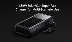 El cargador superrápido para coche/solar DJI Power de 1,8kW se conecta a la batería de un coche y toma el exceso de energía generada por el alternador del coche pero a 600W. Sin embargo, también se puede conectar simultáneamente a una configuración de panel solar de 1200W máx. para una carga doble, aunque con una advertencia.