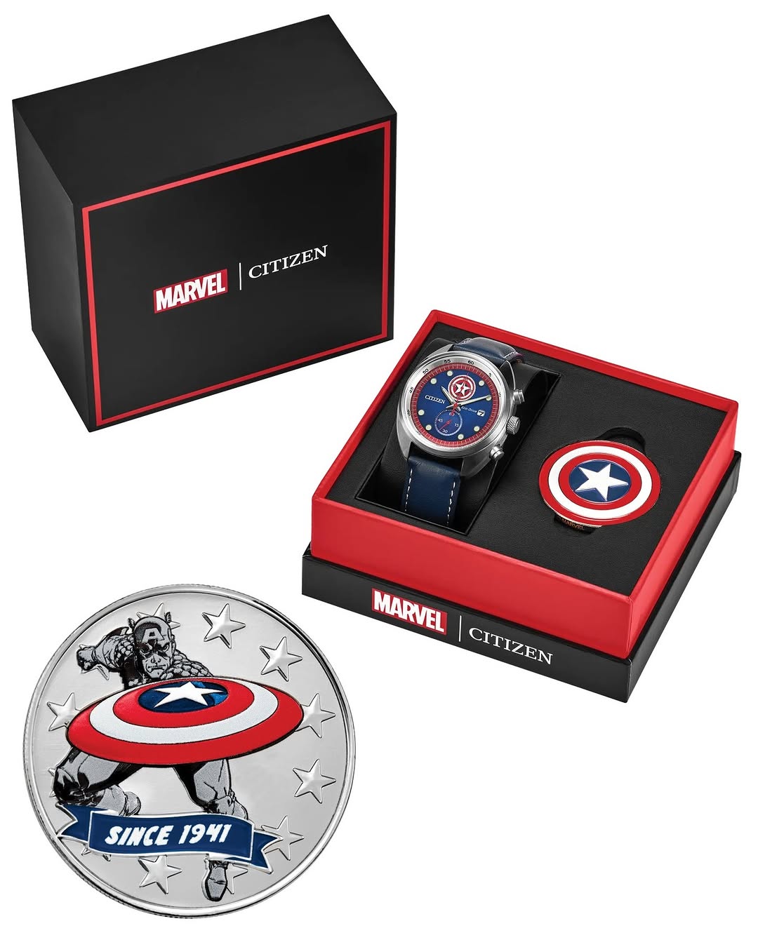El set de presentación completo incluye una moneda de colección del Capitán América, que se muestra por separado en el embalaje. La moneda representa al Capitán América sosteniendo su escudo con el texto "Desde 1941", como referencia al año de la primera aparición del personaje. El propio embalaje hace juego con el tema de la colaboración, utilizando las marcas Marvel y Citizen junto con un diseño en rojo y negro.