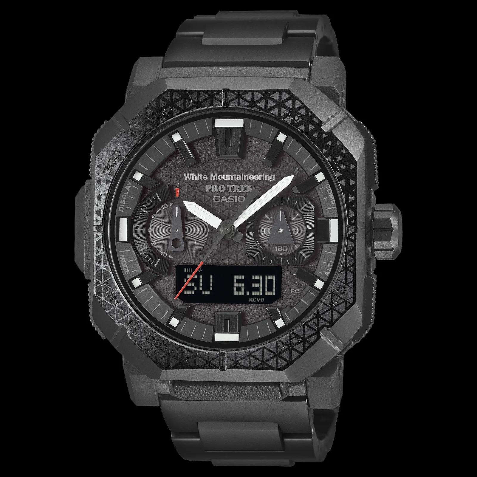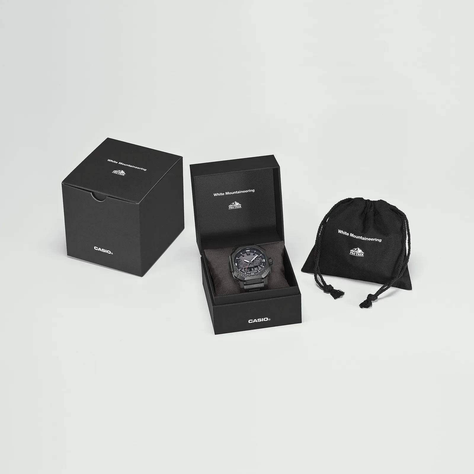 Casio y la marca de moda japonesa White Mountaineering han confirmado finalmente el lanzamiento en febrero de 2026 de su segundo reloj en colaboración, el Pro Trek PRW-B1000WM-1 de gama alta. Alejándose de las construcciones de resina utilizadas en algunos relojes anteriores, esta iteración se basa en el relativamente nuevo chasis PRW-B1000, utilizando una sólida correa de titanio y avanzados sensores técnicos. El modelo tiene un precio aproximado de 140.800 yenes (~900 dólares) y presenta un diseño utilitario en negro mate con el característico patrón triangular de White Mountaineering grabado en el bisel de acero inoxidable chapado en iones.