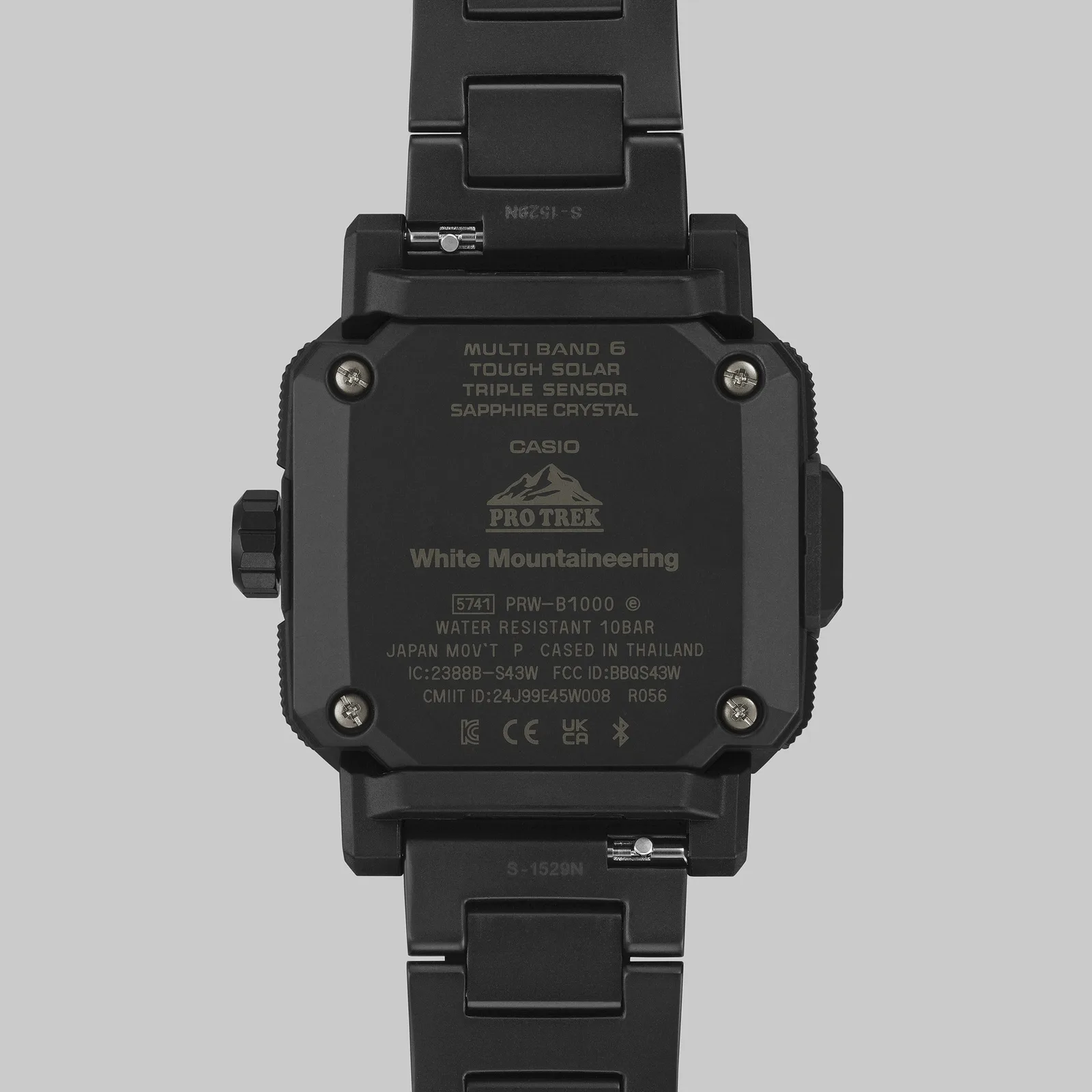 El PRW-B1000WM-1 es el primero de la serie Pro Trek que utiliza la energía Tough Solar, la conectividad Bluetooth para teléfonos inteligentes y el ajuste de la hora por radio Multiband 6, todo ello en una sola unidad. El reloj es ideal para entornos de gran altitud, gracias a su conjunto de "triple sensor" que puede medir la altitud, la presión barométrica, la temperatura y el rumbo de la brújula. Un "Indicador de localización" dedicado en la subesfera de las 9, que sigue el modelo de un pitón de escalada tradicional, funciona en tándem con la aplicación Casio Watches para mostrar la dirección y la distancia hasta los puntos de ruta guardados.