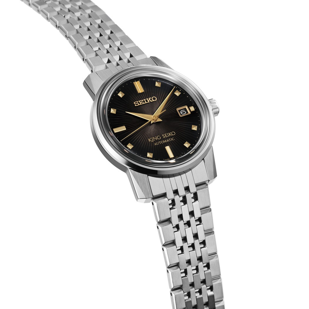 La dirección del diseño del SDKA025 se centra sobre todo en su esfera negra, que presenta un patrón radial estampado para asemejarse a los rayos de luz. Esta superficie texturizada cuenta con agujas y marcadores en tono dorado, incluyendo índices tallados en forma de pirámide que proporcionan un reflejo multifacético de alto contraste. La caja de acero inoxidable tiene la afilada geometría "KSK" (en referencia al 1965 King Seiko KSK).
