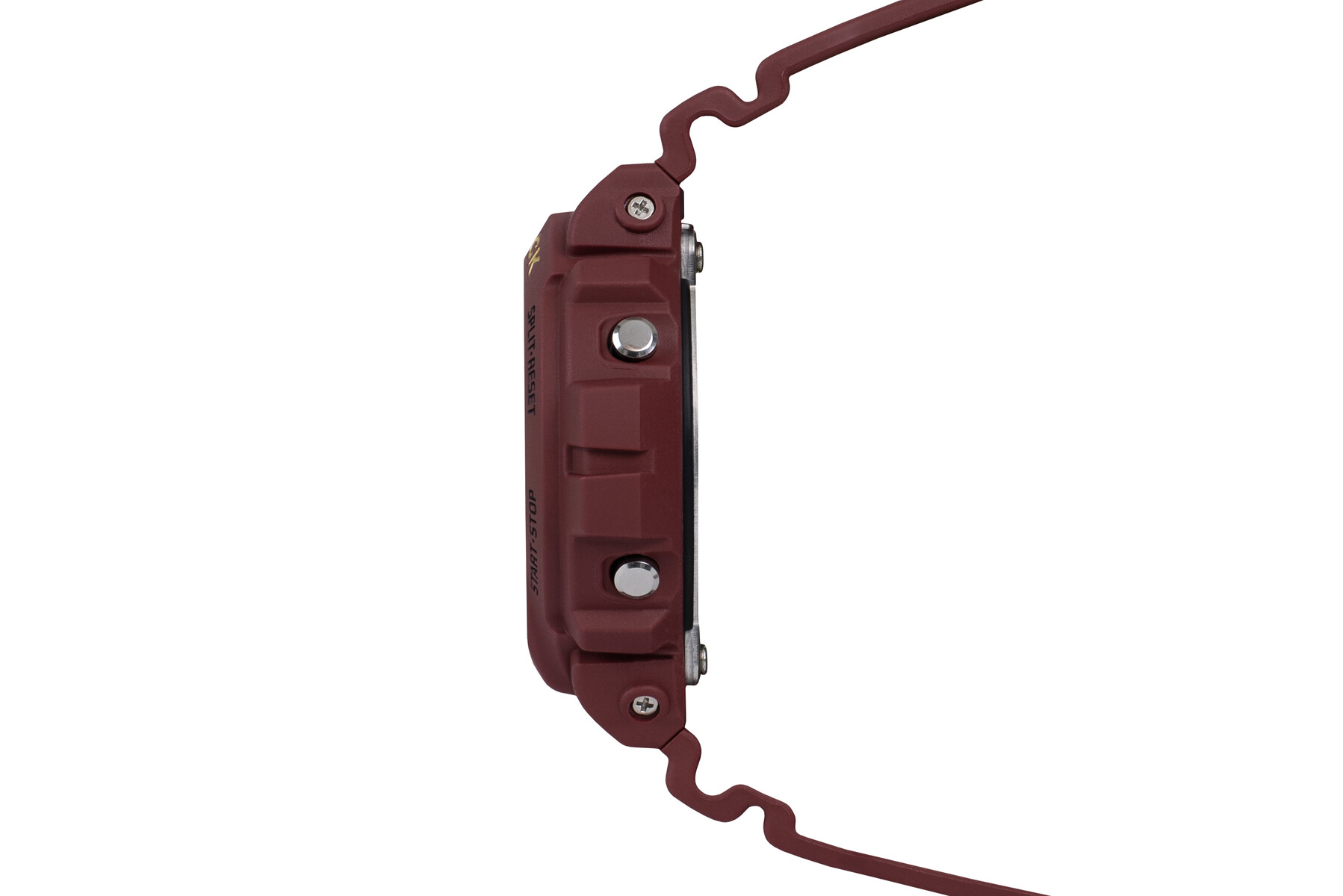 El 14 de octubre Casio desveló un nuevo reloj en colaboración con la exitosa película "Regreso al futuro": el CA-500WEBF. Sumándose a esta lista de colaboraciones, la empresa japonesa ha revelado ahora otra nueva colaboración DW-6900 con SYNAla marca de ropa fundada por el rapero británico Central Cee. El lanzamiento utiliza la forma familiar de la 6900 pero cambia a un acabado burdeos oscuro, un color que SYNA relaciona con los antiguos pasaportes británicos. Estará disponible para su compra en noviembre.