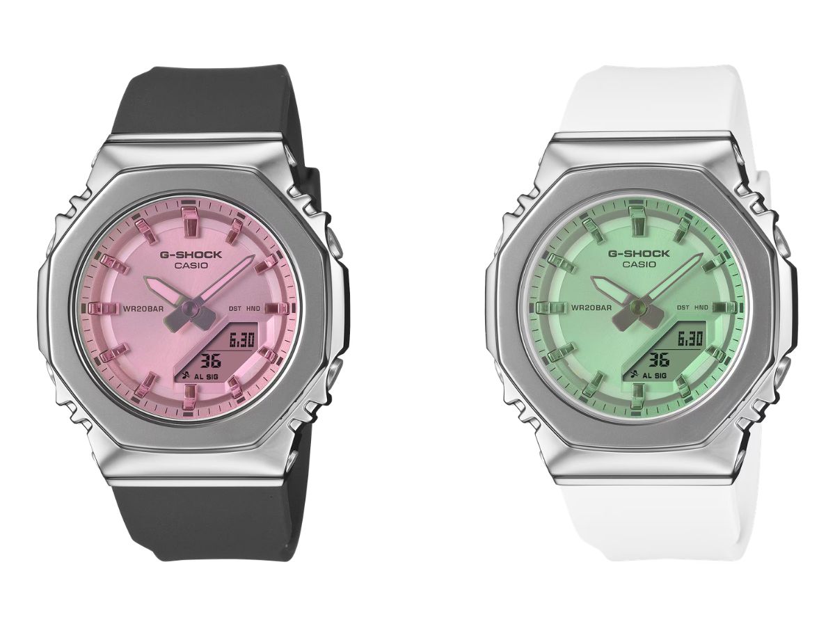 El G-Shock GM-S2110 es un reloj octogonal con bisel de acero inoxidable en tono plateado. El GM-S2110-1A tiene una correa de resina gris oscuro y el GM-S2110-7A tiene una correa de resina blanca. El G-Shock GMA-P2100 es un reloj redondo con carcasa y correas translúcidas, negra para el GMA-P2100SR-1A y transparente para el GMA-P2100SR-7A. Ambos modelos compactos incorporan funciones como la compatibilidad con la hora mundial, un cronómetro y varias alarmas diarias. Además, son resistentes al agua hasta 200 m y tienen una esperanza de vida de la batería de unos tres años.