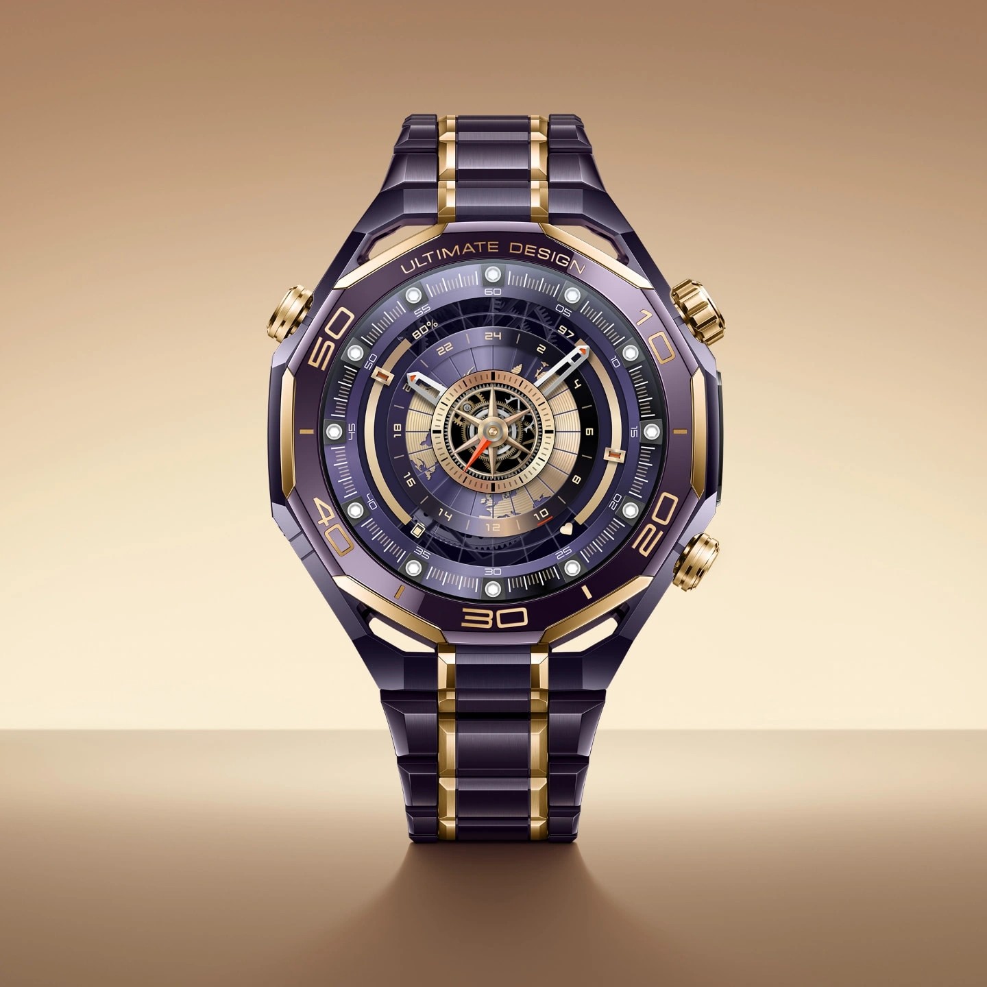 El Watch Ultimate Design Royal Gold Edition es descrito por Huawei como "una joya de la corona en la muñeca". Tiene un diseño predominantemente morado, con un bisel de cerámica de 12 lados y elementos de oro de 18 y 24 quilates. La carcasa púrpura está hecha de un metal líquido a base de circonio, y hay una correa de aleación de titanio púrpura a juego con chapado en oro de 24K. La pantalla está protegida por cristal de zafiro, y el reloj mide 48,3 x 48,3 x 12,9 mm (~1,90 x 1,90 x 0,51 pulgadas) y pesa 80,9 g (~2,85 oz).