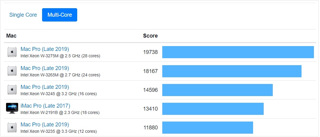 La puntuación multinúcleo de Geekbench ofrecida por Yuryev es de 15.070 puntos, lo que situaría a este hipotético dispositivo basado en el Dispositivo basado en el M1X por encima del Mac Pro de 16 núcleos (finales de 2019). Este último ordenador de sobremesa, muy caro (espere pagar al menos 7.999 dólares por un modelo de 16 núcleos) no se queda atrás, ya que Geekbench registra una puntuación media de 14.596 puntos para el Intel Xeon W-3245 de este ordenador en particular. La predicción de un solo núcleo de 1.740 puntos también parece muy saludable para el Apple M1X, situándolo en lo más alto de la tabla actual de Geekbench https://browser.geekbench.com/mac-benchmarks para dispositivos Mac. Esto era de esperar, ya que los dispositivos con M1, como el Mac mini y el MacBook Pro 13 que encabezan esa tabla en particular en este momento.