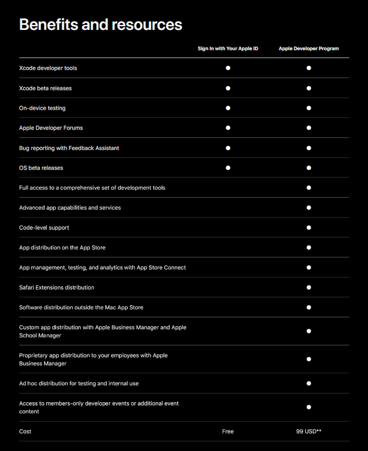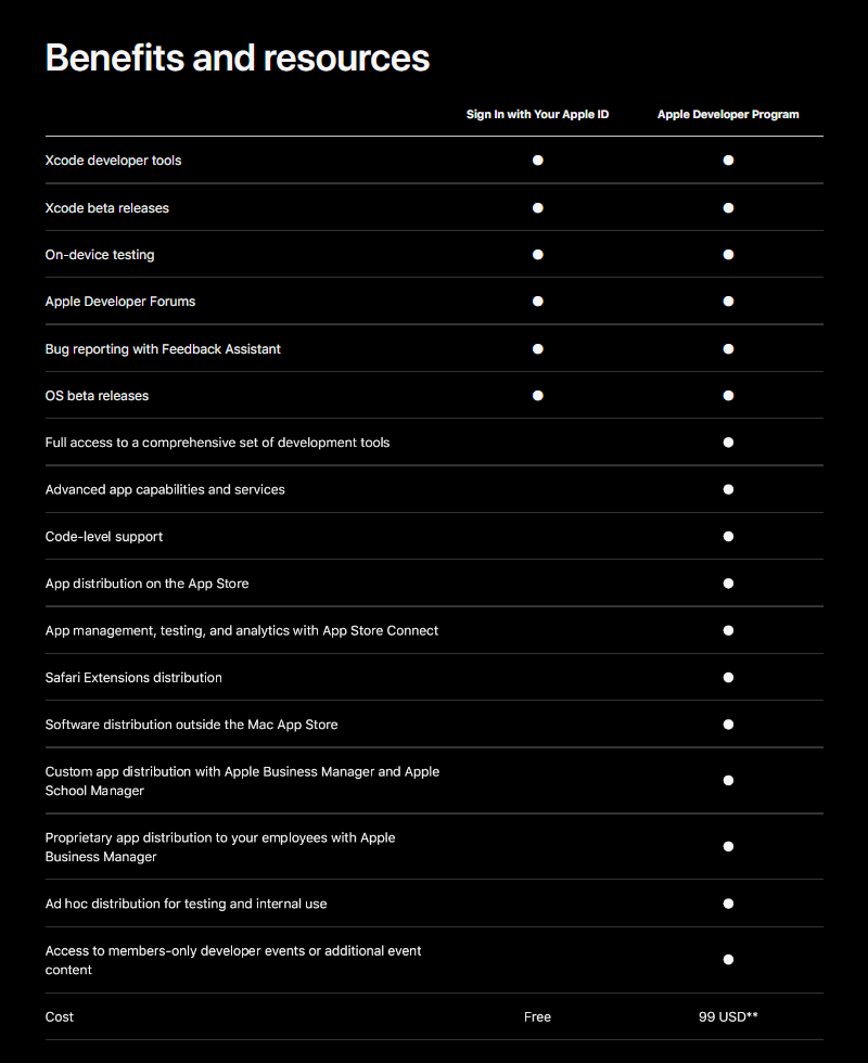 Con este fin, los beneficios del nuevo nivel gratuito también incluyen el acceso a todas las plataformas Apple betas de la plataforma. Por otra parte, si uno de sus suscriptores desea distribuir realmente las nuevas aplicaciones que pueda crear como resultado de su nueva pertenencia al Programa de Desarrolladores, tendrá que pasar a la versión de pago.