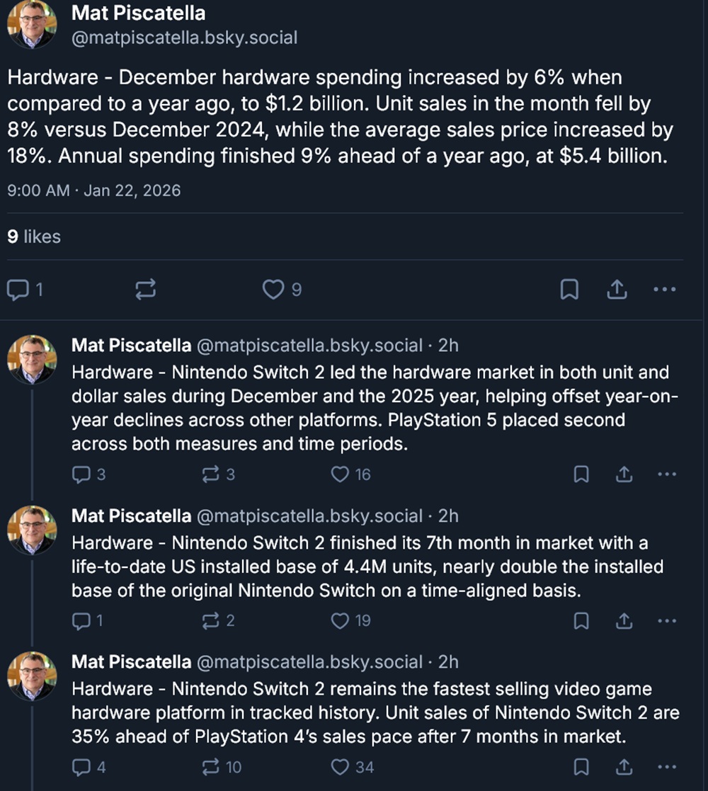 A pesar de las difíciles condiciones económicas, los compradores estadounidenses repuntaron en diciembre. Los ingresos por hardware aumentaron un 6% en el mes con respecto a 2024, incluso con los minoristas moviendo menos unidades. Como algunos sistemas se hicieron menos asequibles, el precio medio de venta de las unidades aumentó un 18%. Los jugadores también aceptaron un precio de Switch 2 considerablemente más alto que el de la anterior consola portátil.