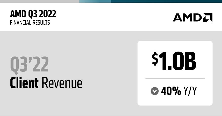 A continuación, AMD explica que los ingresos del segmento de clientes cayeron nada menos que un 40% interanual, hasta los 1.022 millones de dólares, debido a una importante reducción de las ventas de CPU. AMD culpa al "débil mercado de PC y a una importante corrección de inventarios en toda la cadena de suministro de PC" por el letargo de los envíos de procesadores.