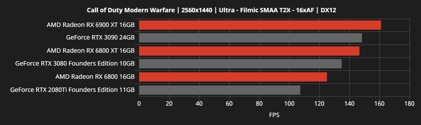 No obstante, los datos proporcionados por AMD apuntan a que el RX 6800 XT y el RX 6900 XT superan al RTX 3090 a 1440p, que el RX 6900 XT mantiene a 4K. El RX 6800 XT se queda atrás del RTX 3090 a 4K, aunque se mantiene un poco por delante del RTX 3080 a esta resolución, en promedio. Mientras tanto, el RX 6800 encuentra un punto medio entre el rendimiento del RTX 3080 y el RTX 2080 Ti en ambas resoluciones. La RX 6800 también tiene un mejor rendimiento, relativamente, a 1440p que a 4K, como la RX 6800 XT y la RX 6900 XT.