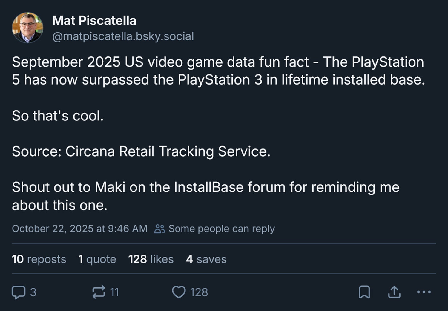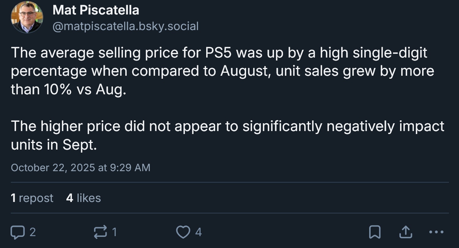 Matt Piscatella puso al día al público con una serie de posts de Bluesky. Señala que, en relación con agosto, el "precio medio de venta de PS5 subió en un alto porcentaje de un solo dígito". A pesar de los MSRP más elevados, las ventas de unidades aumentaron más de un 10% en septiembre.