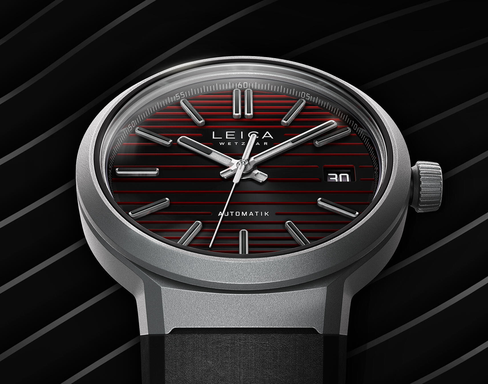 También cabe destacar el innovador sistema de cambio de correa Easy-Change integrado en las asas de la caja, que refleja el sistema de liberación del objetivo de las cámaras Leica. Para soltar la correa basta con pulsar un botón con el característico punto rojo de Leica. La caja está disponible en titanio de grado 5 o en acero inoxidable 316L con una resistencia al agua de 100 m, y las opciones de correa incluyen titanio, acero inoxidable, caucho y tela.