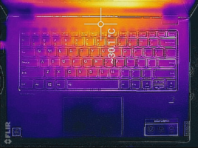 Las temperaturas se mantienen igualmente bien. Bajo carga, la mayor parte del dispositivo permanece relativamente frío; el calor se concentra a lo largo del centro superior. El centro de la fila de funciones (F5-F8) se sentirá caliente, y el centro superior del panel inferior puede causar molestias en una vuelta. Por lo tanto, recomendamos utilizar el portátil sobre una superficie plana en modo portátil al empujar la máquina.