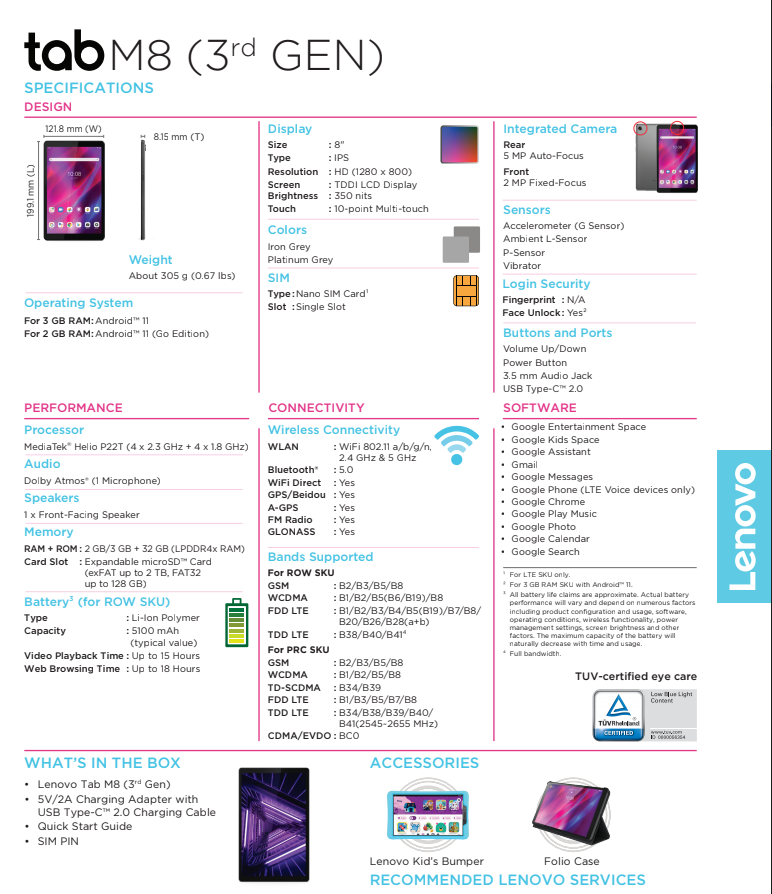 La Lenovo Tab M8 cuenta con un panel LCD de 8 pulgadas con una resolución de 1.200 x 800 píxeles y un brillo máximo de 350 nits. A MediaTek Helio P22 Junto con hasta 4 GB de RAM LPDDR4x y 64 GB de almacenamiento interno, que puede ampliarse mediante una tarjeta micro SD. La Lenovo Tab M8 se alimenta de una batería de 5.100 mAh que no es compatible con ningún estándar de carga rápida. Al menos, viene con un puerto USB Type-C, lo que supone una mejora significativa respecto a su predecesor. Lenovo dice que uno puede obtener hasta 15 horas de reproducción de vídeo con una sola carga