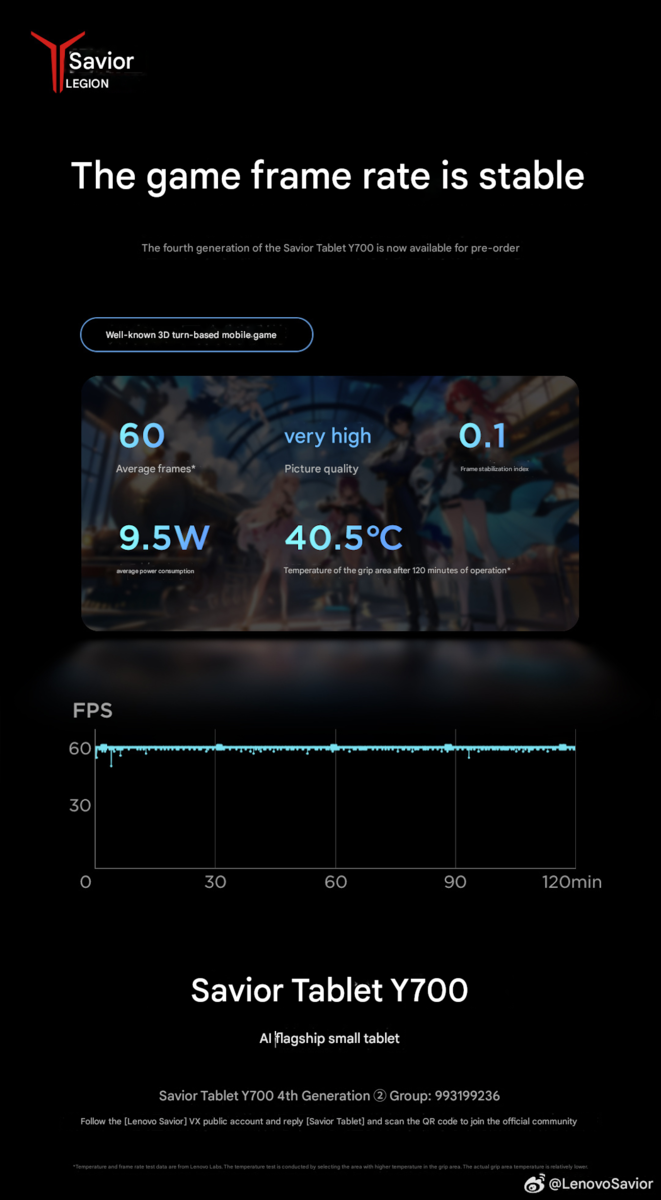En un "conocido MOBA juego para móviles", se dice que la tableta de juego mantiene una media de 120 FPS con una calidad de imagen "extrema". Durante la sesión de 30 minutos, el consumo medio de energía es de 8,9 W. Por último, en un "famoso juego battle royale", la Lenovo Legion Tab Gen 4 alcanza una media de 119,9 FPS durante una sesión de 30 minutos. Se afirma que el consumo medio de energía es de 8 W.