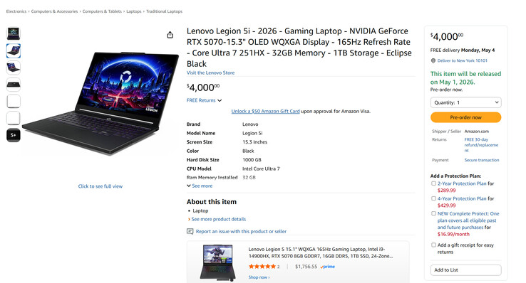 Mientras tanto, el usuario de X Huang514613 ha visto diferentes versiones a la venta en Cendirect Canadá y en Amazon EE.UU. por 4.000 dólares. Como muestra la imagen inferior, Lenovo ha listado el Legion 5i con una pantalla OLED de 15,3 pulgadas, 1 TB de almacenamiento y 32 GB de RAM en un acabado Negro Eclipse. En otras palabras, esto coincide con el hardware de las variantes Panther Lake existentes.