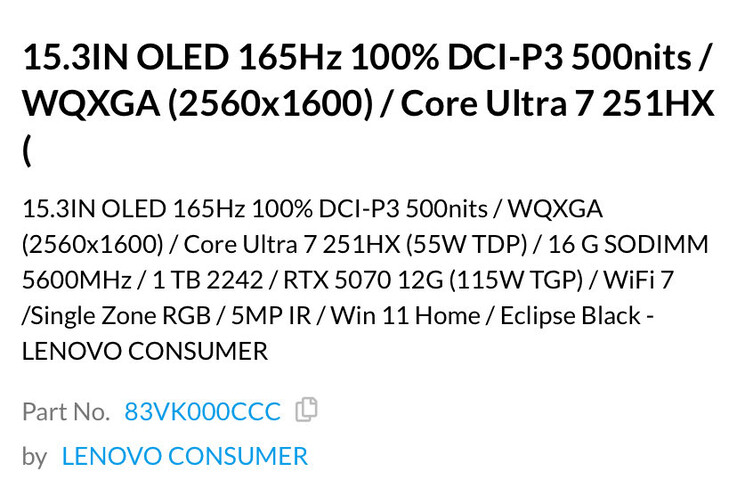 Por lo que sabemos, esta variante está disponible desde hace casi un mes con el número de modelo 83VK0008US. Sin embargo, el número de modelo mostrado no aparece actualmente en la Referencia de Especificaciones de Producto (PSREF) de Lenovo, ni tampoco el 83VK000CCC que Huang514613 también ha descubierto en Cendirect Canada. Como resultado, sospechamos que Lenovo presentará oficialmente esta versión más cerca de su fecha de lanzamiento oficial del 1 de mayo.