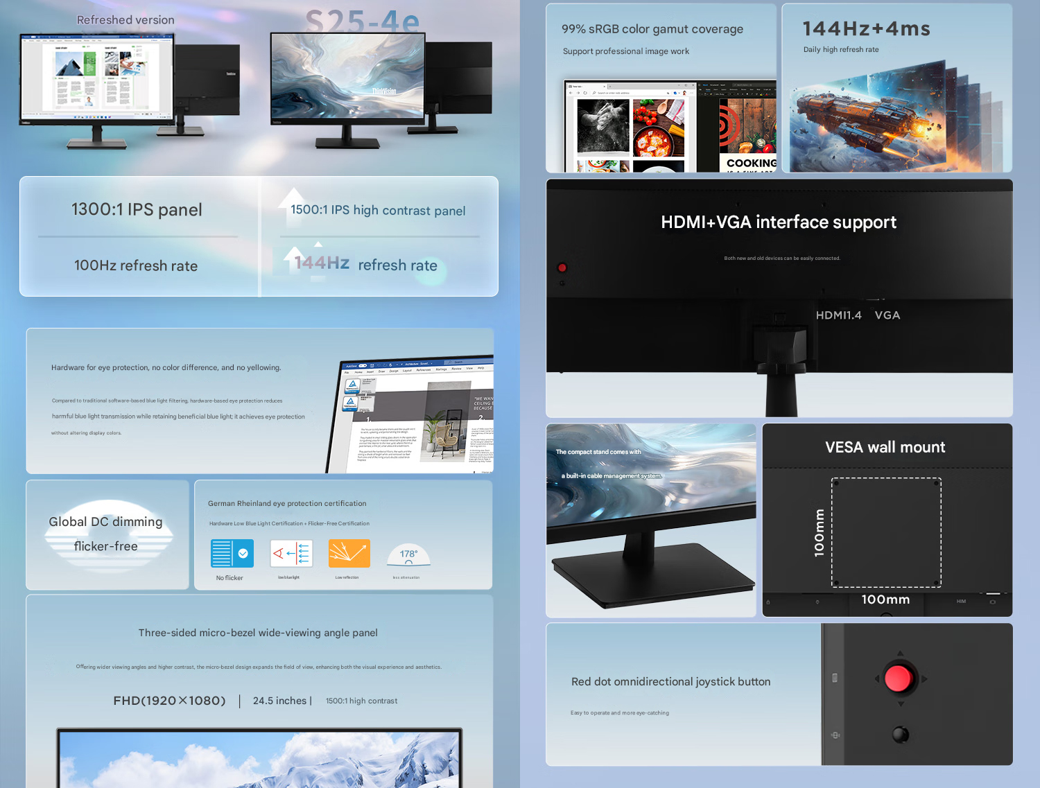 A diferencia de los monitores de gama alta, no hay muchas opciones de conectividad disponibles en este monitor Lenovo asequible. En concreto, el ThinkVision S25-4e cuenta con un HDMI 1.4 y un Puerto VGA. Otras características destacadas son el icónico botón rojo del joystick para la navegación por el sistema, la compatibilidad con VESA (el soporte Huanuo VESA para dos monitores cuesta actualmente 59,99 $ en Amazon) y un diseño relativamente elegante.