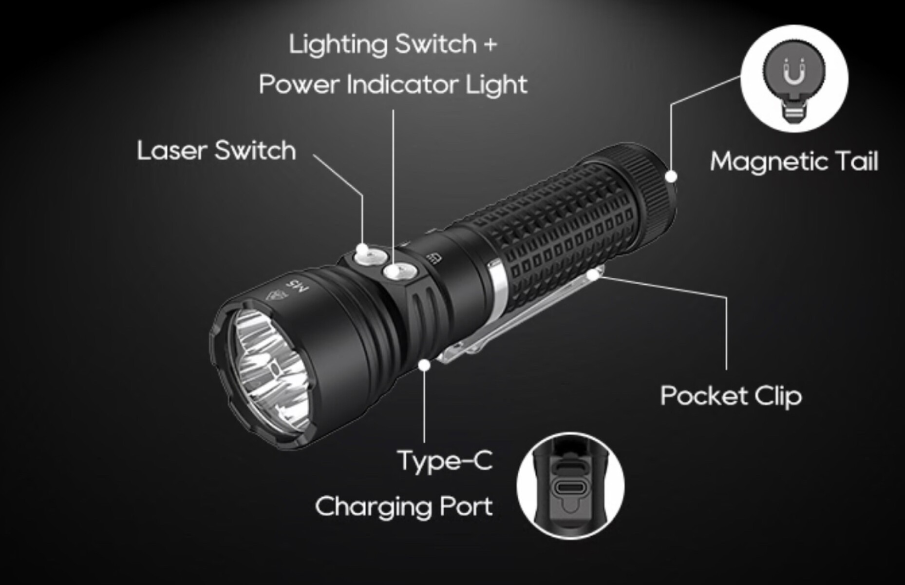 A primera vista, la TerraBeast M5 parece una linterna bastante anodina con una carcasa de aluminio negro con certificación IP66, lo que significa que se puede dejar caer al agua sin sufrir daños. Sin embargo, una característica más o menos inusual es el láser integrado.