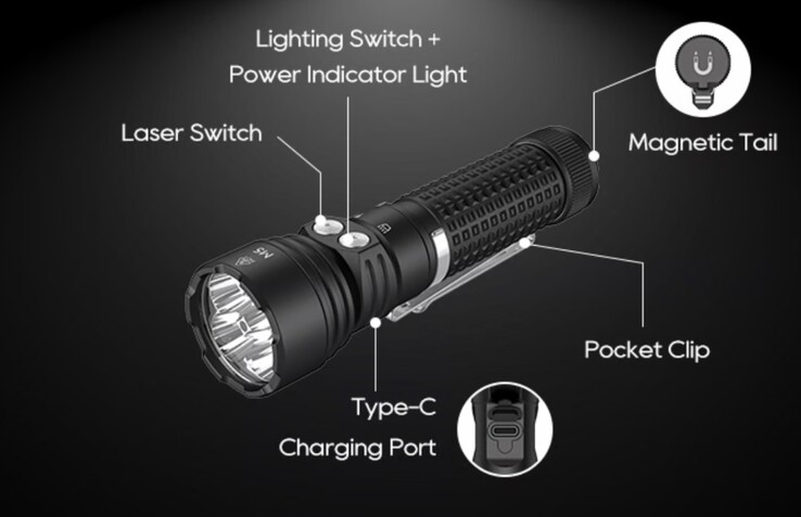La linterna está equipada con cuatro LED Luxeon HL4X, que pueden producir hasta 5.200 lúmenes. Este rendimiento es similar al de la más cara Nitecore EDC29, que suele venderse por 100 dólares en Amazon. El fabricante anuncia además un alcance de hasta 293 yardas. La duración de la batería anunciada de 30 días sólo se aplica al ajuste de brillo más bajo, ya que la autonomía será significativamente menor con ajustes más altos. Lamentablemente, el fabricante no proporciona cifras exactas al respecto. En cualquier caso, la batería de 4.500 mAh se puede cargar a través de USB-C.