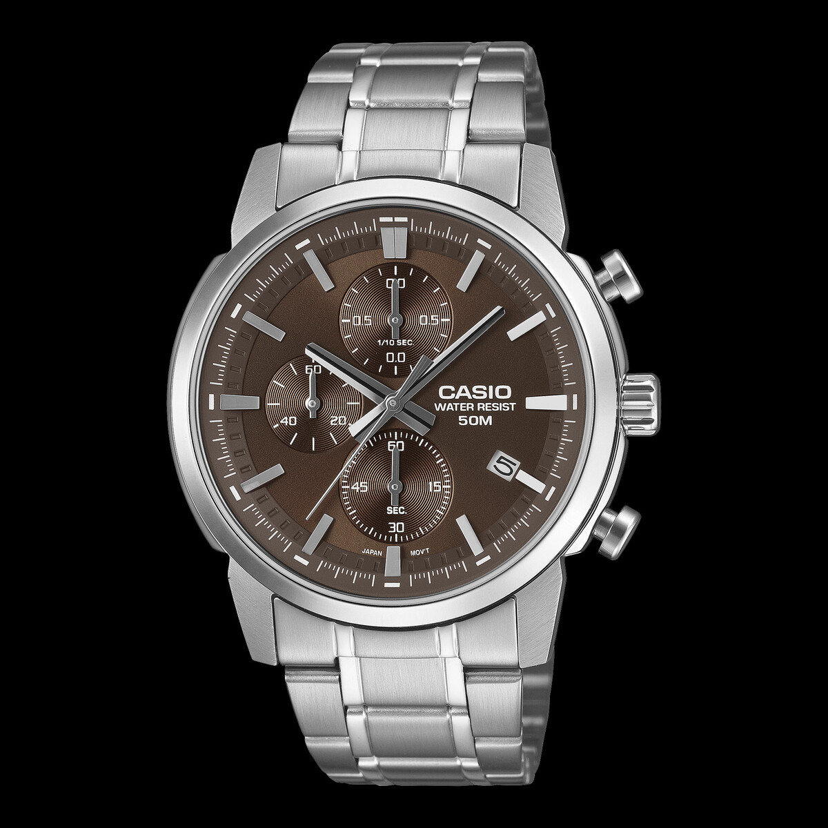 Más allá del cronometraje básico, dispone de un cronógrafo preciso con una exactitud de 1/10 de segundo. Los subdiales muestran los minutos a las 9 en punto, los segundos a las 6 en punto y las décimas de segundo a las 12 en punto. De nuevo, esto es poco habitual en la serie Standard de Casio, lo que ayuda a que el MTP-E510D tenga un lenguaje de diseño propio y separado de los relojes de cuarzo de gama básica. Sin embargo, vale la pena subrayar que no se trata de piezas premium. La caja y el brazalete de acero inoxidable (con eslabones no sólidos) mantienen los costes bajos sin sacrificar la apariencia de robustez. Las dimensiones son un término medio con 47,5 × 42 × 10,5 mm, lo que significa que estos relojes deberían ajustarse a la mayoría de las muñecas sin parecer sobredimensionados.