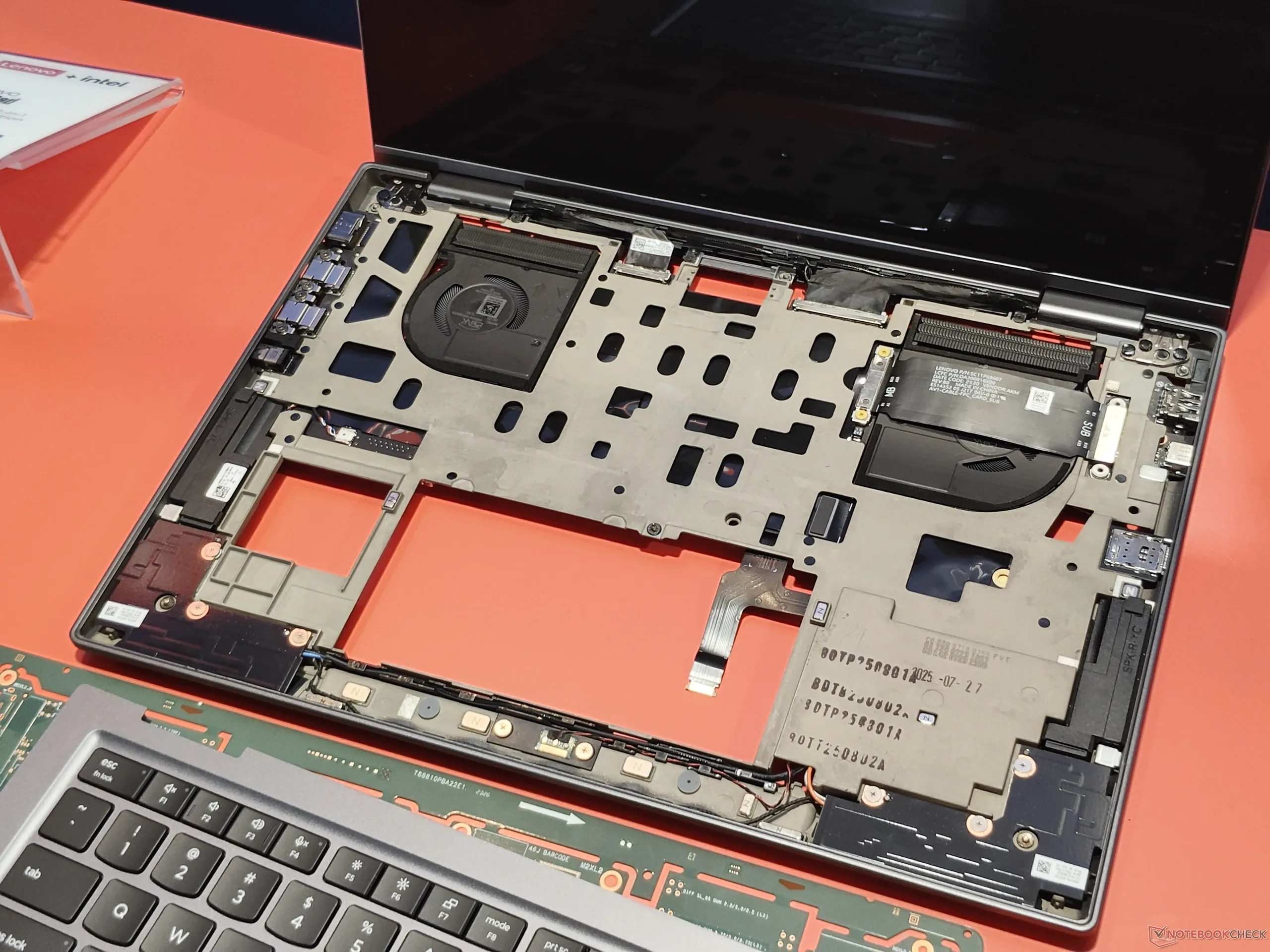 Otra ventaja es el mejor aprovechamiento del espacio disponible, de ahí lo de "marco espacial". Al colocar algunos componentes en el otro lado del nuevo marco intermedio, como los conectores de la pantalla y las antenas Wi-Fi, Lenovo pudo liberar un valioso espacio, que se utilizó para aumentar el tamaño del sistema de refrigeración, lo que permite refrigerar hasta 30 W a plena carga en lugar de sólo 22,5 W en el anterior X1 Carbon Gen 13(disponible en Amazon). Esto es especialmente útil con las nuevas CPU Panther Lake, ya que el Intel Core Ultra X7 necesita más energía para rendir significativamente mejor que las anteriores CPU Lunar Lake. Además, con la nueva placa base más pequeña, Lenovo ha podido modular los puertos USB C y colocar algunos de los otros puertos en una placa secundaria independiente.