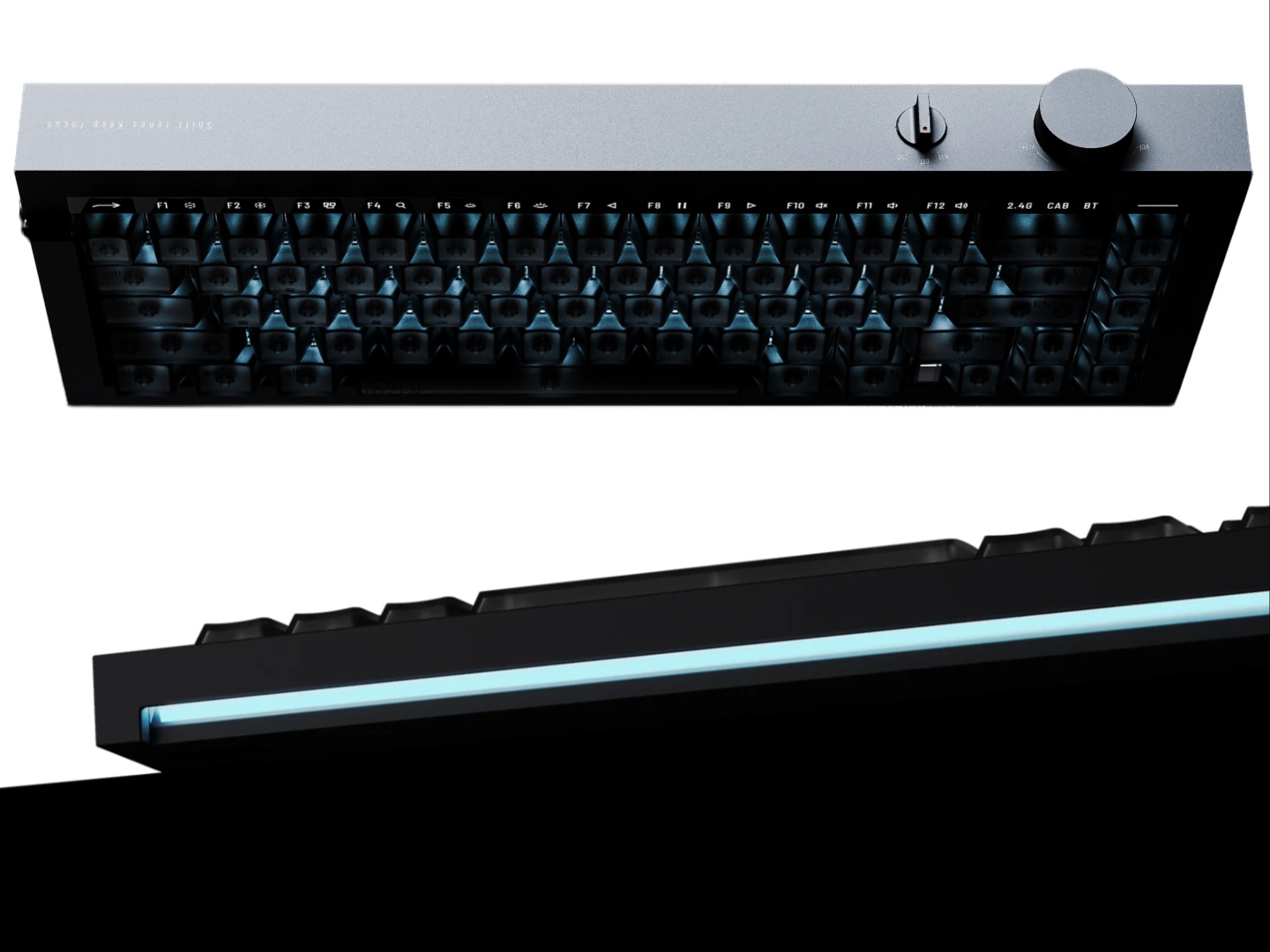 En cuanto al diseño, el chasis ha sido fresado mediante CNC a partir de un único bloque de aluminio. Es un teclado al 65%, pero integra de forma inteligente la fila de funciones a través de una palanca dedicada e indicadores LED. Hay un mando para controlar el audio y un interruptor basculante de tres vías para los modos de alimentación, con cable e inalámbrico. Aunque no hay pies en la parte inferior, Lofree ha añadido una inclinación de 12 grados para una posición de tecleo más ergonómica. El Hyzen también tiene una barra de luz LED en la parte inferior, orientada hacia abajo.
