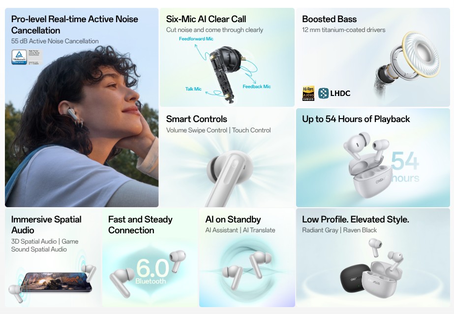 Cada auricular tiene tres micrófonos y funcionan con un algoritmo de IA propio para detectar y reducir el ruido del viento y del tráfico durante las llamadas. Otra novedad de los auriculares es que cuentan con la certificación Hi-Res Audio y son compatibles con LHDC 5.0. También disponen de audio espacial 3D y audio espacial Game Sound.