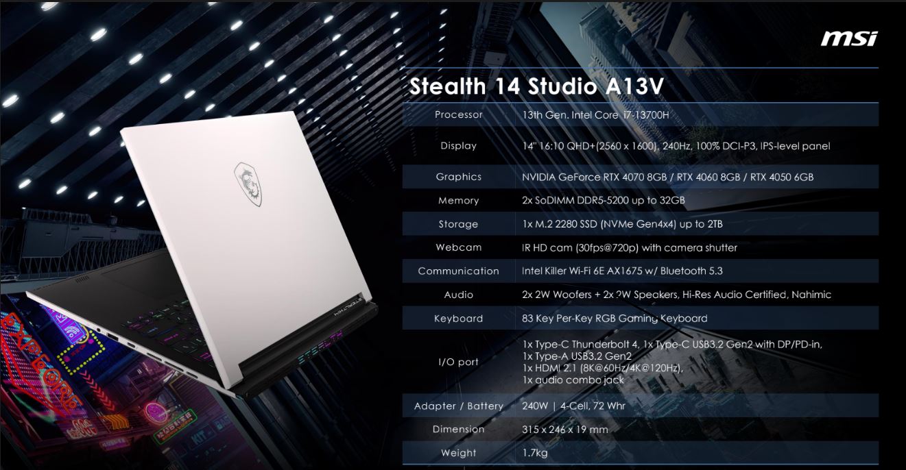 En el interior, tanto el Stealth 14 como el Stealth 16 emplean la13ª generación de chips Raptor Lake para portátiles con la nueva generación de Nvidia RTX 40 para portátiles De Nvidia. En el caso del Stealth 14, los usuarios se limitan a un Core i7-13700H junto con la posibilidad de elegir una gráfica RTX 4070/ RTX 4060/ RT 4050. El Stealth 16, por su parte, tiene opciones Core i7 y Core i9, pero está limitado a las GPU RTX 4070 y RTX 4060.