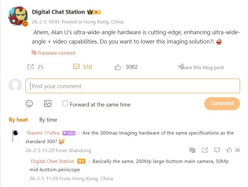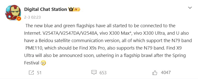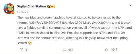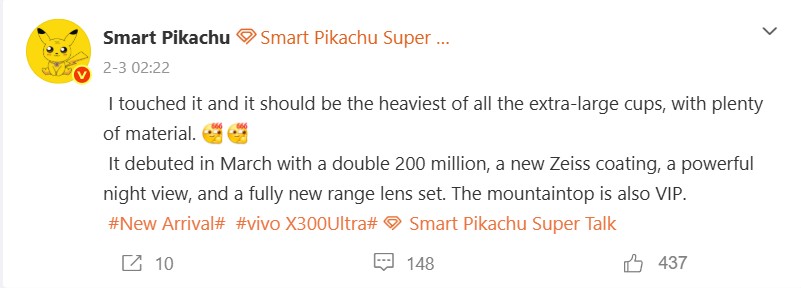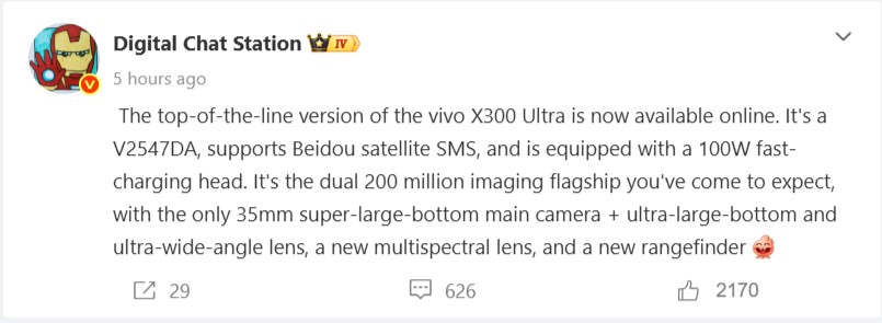 Una ventaja significativa del Vivo X200 Ultra sobre sus competidores era, y sigue siendo, su cámara ultra gran angular de 1/1,28 pulgadas. Es probable que esta característica se mejore aún más en el modelo sucesor, tal y como explicó recientemente Digital Chat Station en Weibo. Se espera que las grabaciones de vídeo en particular se beneficien del mejor ultra gran angular de la industria. Otro aspecto interesante de este post es un comentario en el que se menciona un Vivo X300 Max, que aparentemente se lanzará en China al mismo tiempo que el Vivo X300 Ultra y es probable que sea un mayor Vivo X300 con características de cámara similares