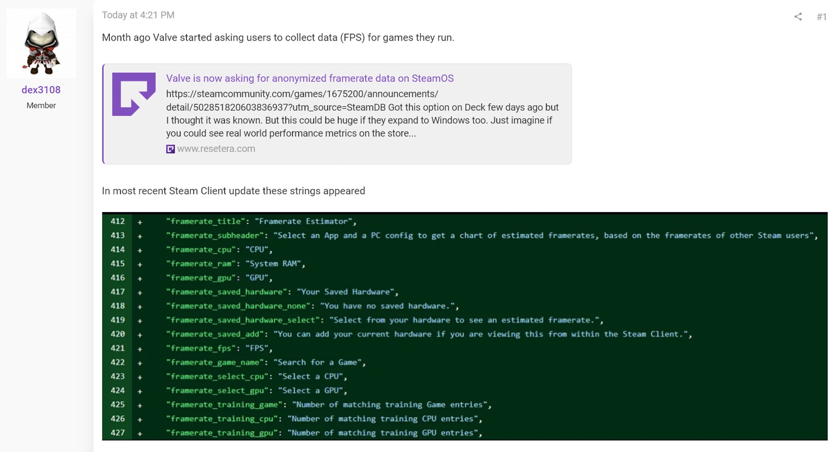 Dex3108 en los foros de ResetEra ha observado una curiosa actualización en el código del cliente de Steam. Una línea dice: "Seleccione una aplicación y una configuración de PC para obtener un gráfico de velocidades de fotogramas estimadas, basado en las velocidades de fotogramas de otros usuarios" Sugiere que los jugadores podrán introducir sus especificaciones, incluyendo CPU, GPU y capacidad de memoriapara ver cómo podría ejecutarse un juego.