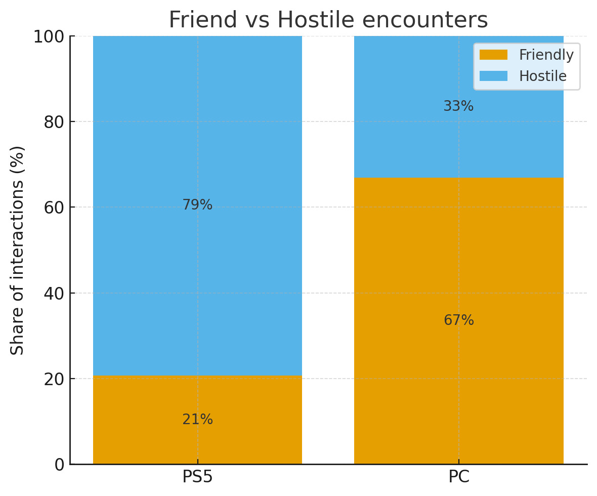 Los gráficos recopilados (véase más abajo) a partir de sus datos (gracias a u/Scared-Computer502) dejan aún más claro ese contraste. En pocas palabras, los jugadores de PC mostraron una mayor proporción de acciones amistosas o cooperativas, mientras que los encuentros de PS5 dieron lugar a más puñaladas por la espalda y hostilidad instantánea. Tenga en cuenta que el tamaño de la muestra sigue siendo pequeño y se limita a sólo dos jugadores y una semana de juego, pero la diferencia entre las dos experiencias fue lo suficientemente amplia como para que ambos consideraran que merecía la pena compartirla. Para estos dos jugadores (al menos), Arc Raiders se sintió como dos juegos diferentes dependiendo de dónde jugasen.
