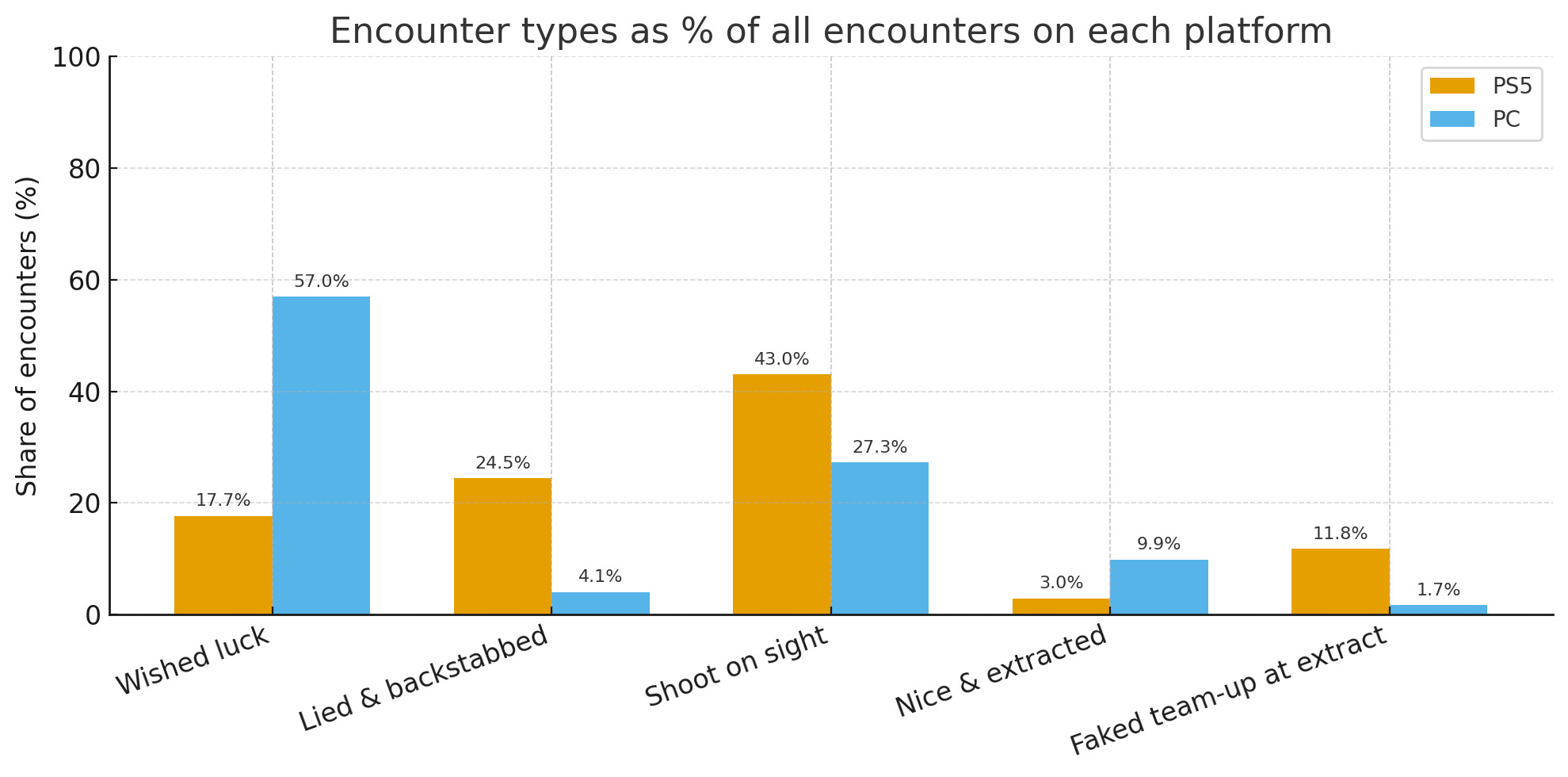 El jugador de PS5 realizó 84 rondas y se encontró con 237 jugadores. Una gran parte de esos encuentros fueron hostiles. De todos los jugadores que conoció, 102 dispararon en el acto. Otros 58 fingieron cooperar antes de asestar una puñalada por la espalda. Las interacciones amistosas existieron, pero fueron bastante limitadas: sólo 42 le desearon suerte y 7 se mantuvieron juntos el tiempo suficiente para extraer como equipo. Incluso los intentos de formar equipos cortos a menudo acabaron mal, con 28 jugadores fingiendo cooperación antes de volverse hostiles en la zona de extracción.